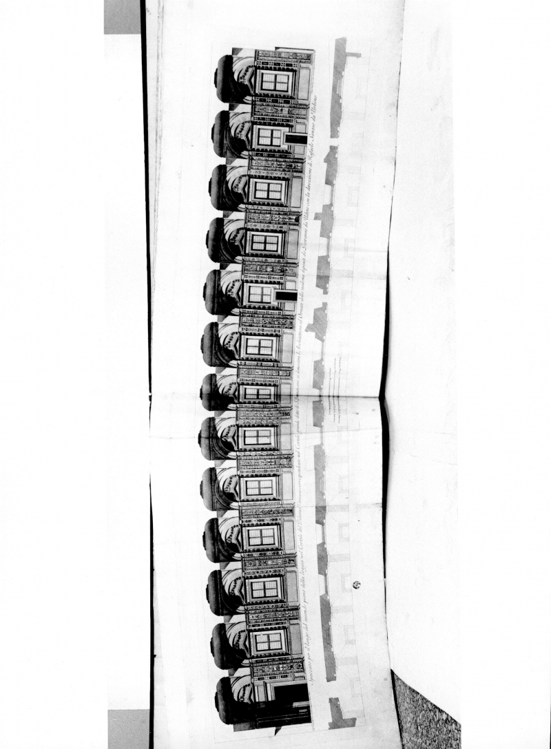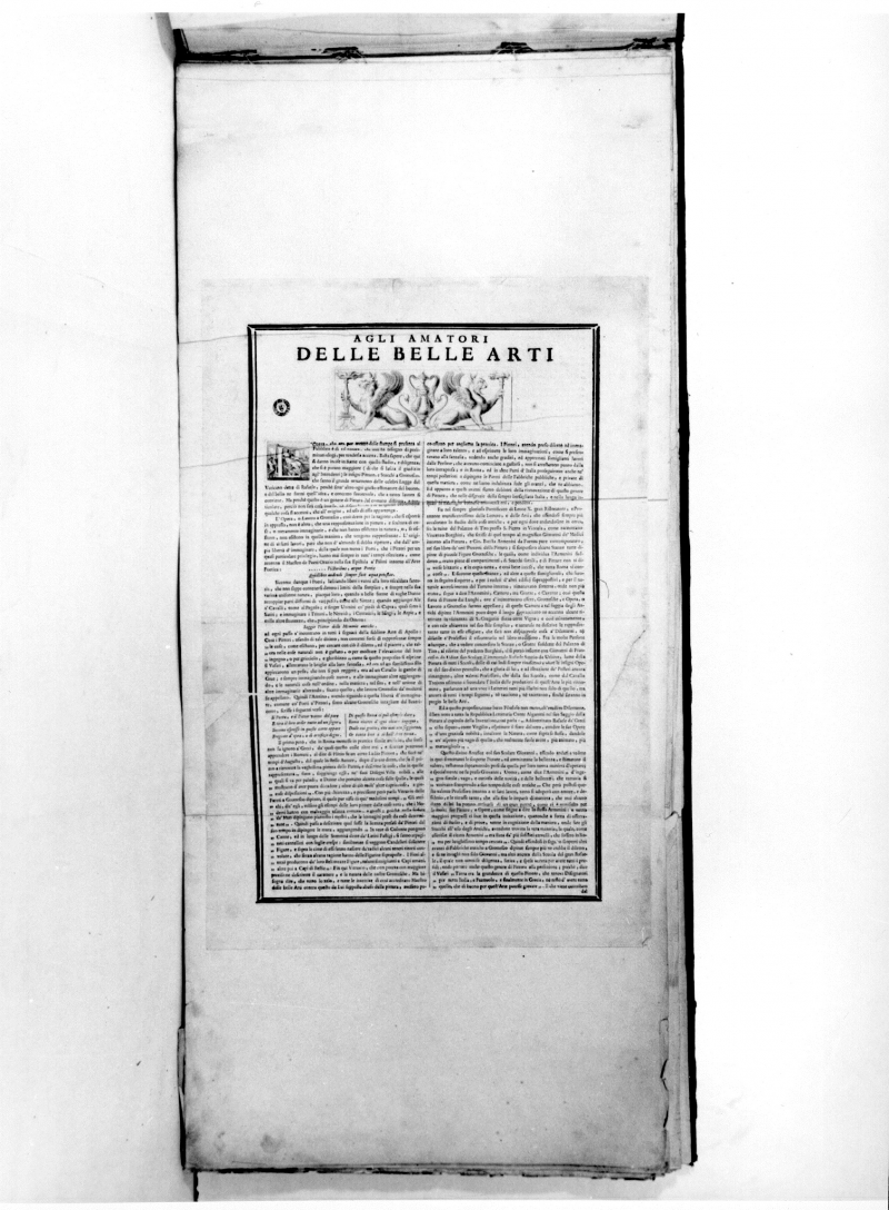 La I parte della pubblicazione a stampa de “Logge di Rafaele nel Vaticano ", Roma, M. Pagliarini, 1772-1776; costituita da 1 pagina di testo a stampa (RECTO/VERSO), incollata nel verso a finestra lungo i margini +1 frontespizio incollata nel verso a finestra lungo i margini, inciso all’acquaforte con “Loggie di Rafaele nel Vaticano” + 2 tavole illustrate incise all’acquaforte (Lastra: 760x444) con Veduta frontale di portali (nell’inciso, in alto a destra A-B) + 14 tavole illustrate incise all’acquaforte tirate direttamente sulla pagina su 2 o 3 fogli giuntati latitudinalmente (Lastre: 198x355; 260x320), numerate progressivamente nell’inciso, in alto a destra (Num. I-XIV) con la riproduzione degli ornati dei pilastri delle Logge affrescate da Raffaello.