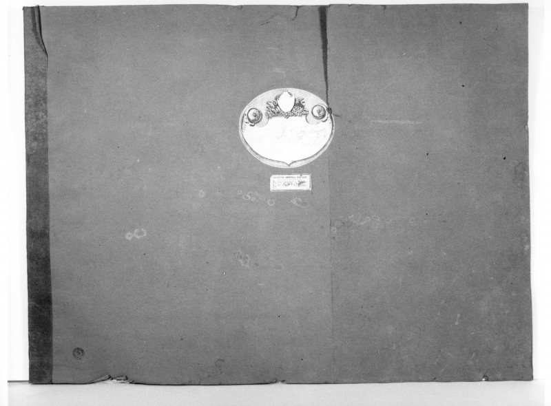CARTELLINI: Nel piatto superiore al centro, è stato incollato un cartellino profilato da una cornice azzurra stampata e decorata con putti, mascheroni e festoni, all'interno manoscritta a lapis: “La Via Crucis/del Sabatelli”; Nel piatto superiore al centro è stato incollato il cartellino stampato "COLLEZIONE ARTISTICA BARTOLINI/catalogo/Num. progress. […]/Sez. […] N. […]”.