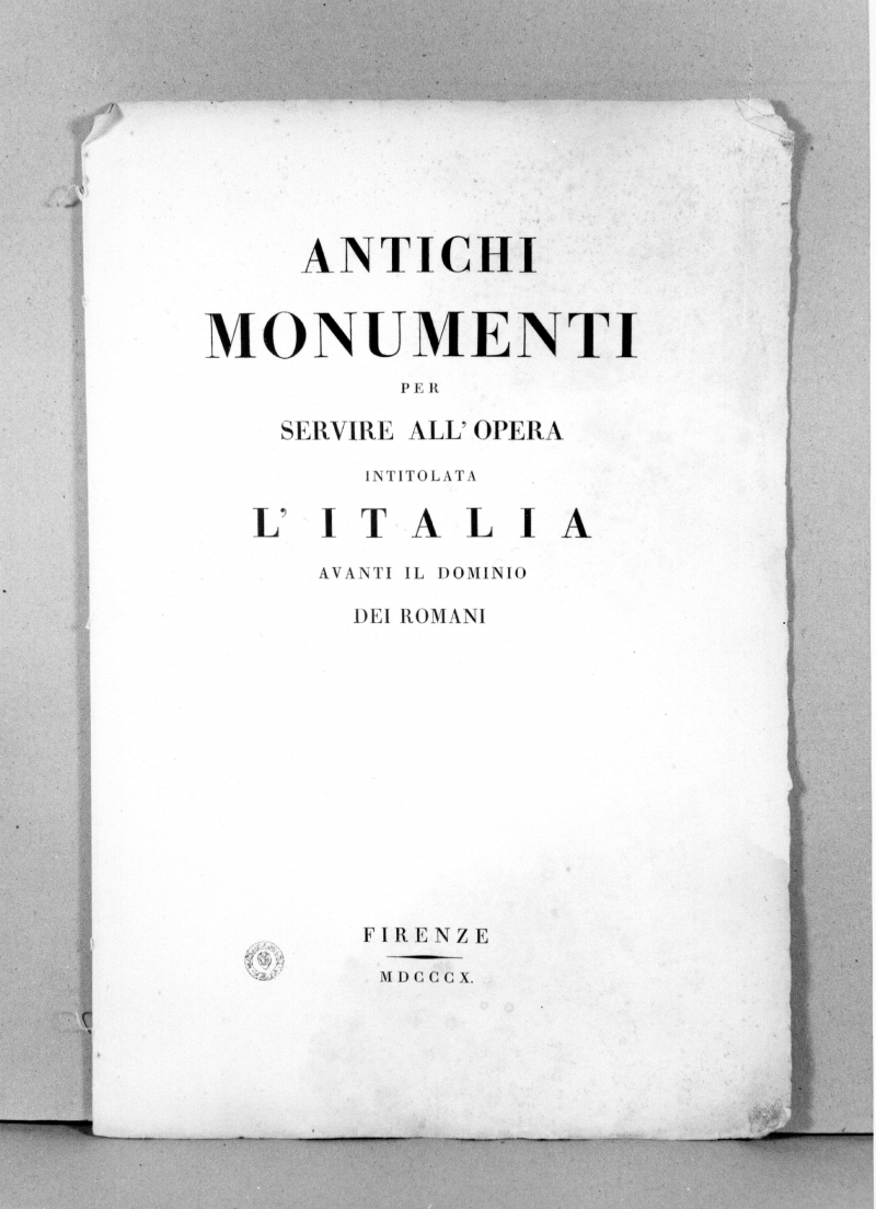 CONTIENE: Esemplare frammentario tratto dalla pubblicazione a stampa “Antichi monumenti per servire all’opera intitolata l’Italia avanti il dominio dei Romani”, G. Micali, Firenze, 1810: frontespizio, prefazione, spiegazione delle tavole in rame, grande carta geografica raffigurante l’ Italia (Lastra: 600x507) e 17 tavole incise all’acquaforte su rame e numerate nell’inciso, in alto a destra (Tavv. I-XVII) ed una vignetta con intaglio rappresentante Ercole (dalla Val di Chiana) (Lastra: 142x115).