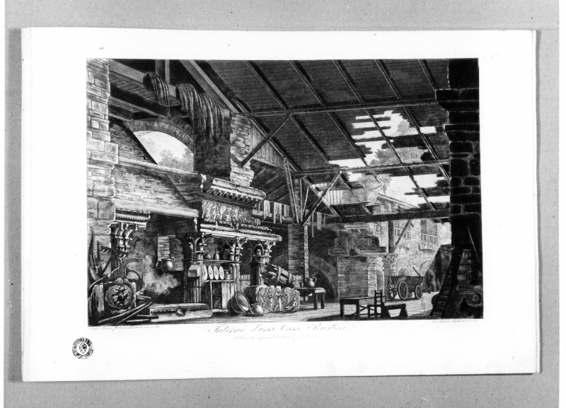 Tav. 1: "Interno d'una Casa Rustica. Fabricata sopra Avanzi di Rovine.", F. Inghirami da L. Tasca, (Lastra:293x400);