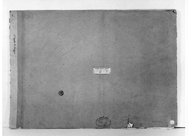 CARTELLINI: Nel piatto superiore al centro è stato incollato il cartellino stampato "COLLEZIONE ARTISTICA BARTOLINI/catalogo/Num. Progress. 293/Sez. VII N. 131 "; Nel dorso, in alto, è sato incollato il cartellino bianco: "L"; Nel piatto superiore in basso a destra, è stato incollato un cartellino circolare stampato "14i”, al di sopra la seguente iscrizione, manoscritta a lapis: “T”.