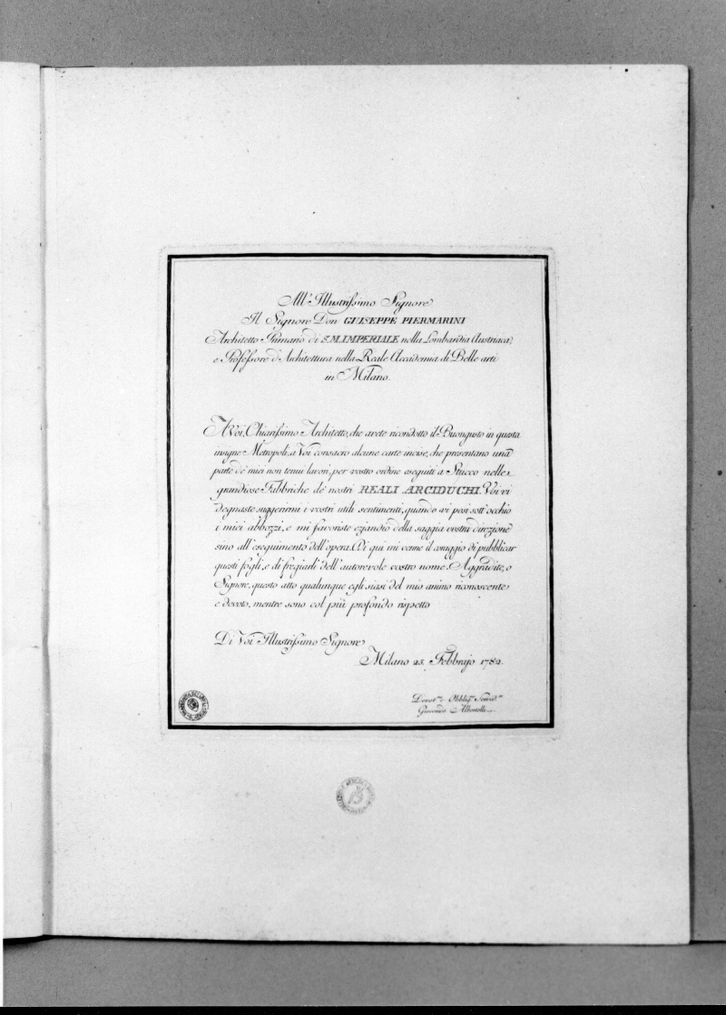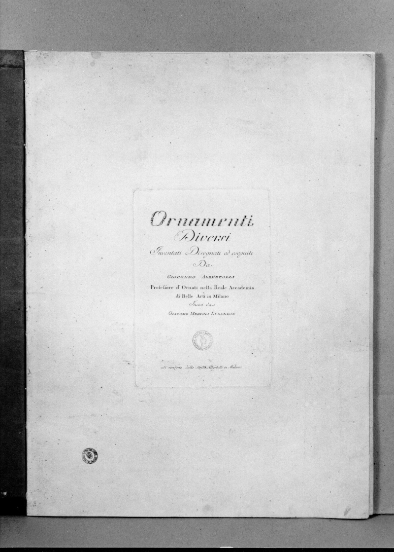CONTIENE: 21 incisioni a bulino: 1 frontespizio con margine (Lastra: 225x151): “Ornamenti Diversi Inventati Disegnati ed eseguiti Da Giocondo Albertolli Professore d’Ornati nella Reale Accademia di Belle Arti di Milano. Incisi da Giacomo Mercoli Luganese. Si vendono dallo stesso Albertolli in Milano”; 19 tavole (Lastre: 465x322; 455x250; 343x240)numerate progressivamente in alto a sinistra II-XX, illustranti gli ornati ideati per decorare il palazzo Arciducale di Milano, ; 1 tavola dedicatoria con margine (Lastra: 295x245) a Giuseppe Piermarinio da Giocondo Albertolli: “All’Illustrissimo Signore il Signore Don Giuseppe Piermarini Architetto Primario di S.M. Imperiale nella Lombardia Austriaca …”.