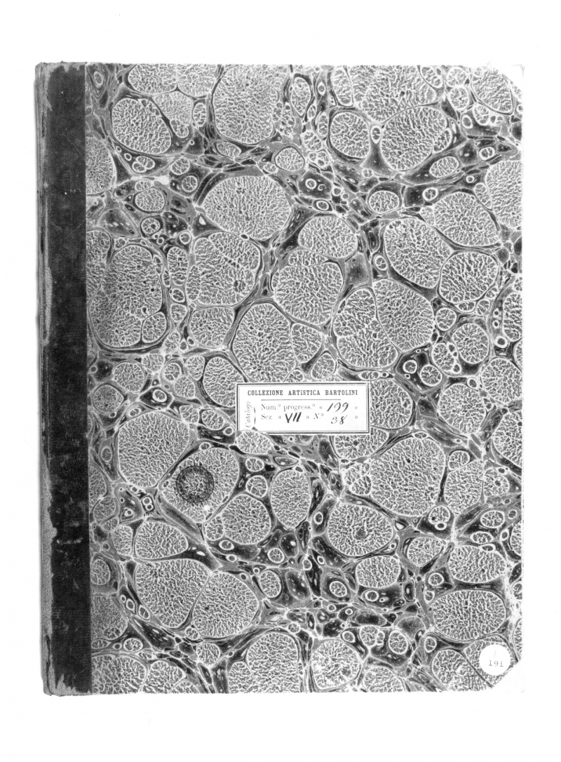 CARTELLINI: nel piatto superiore al centro è stato incollato il cartellino stampato "COLLEZIONE ARTISTICA BARTOLINI/catalogo/Num. progress. 199 sez. VII N. 38”; Nel piatto superiore in basso a destra, è stato incollato un cartellino circolare stampato "19i" al di sopra manoscritta a lapis "T".