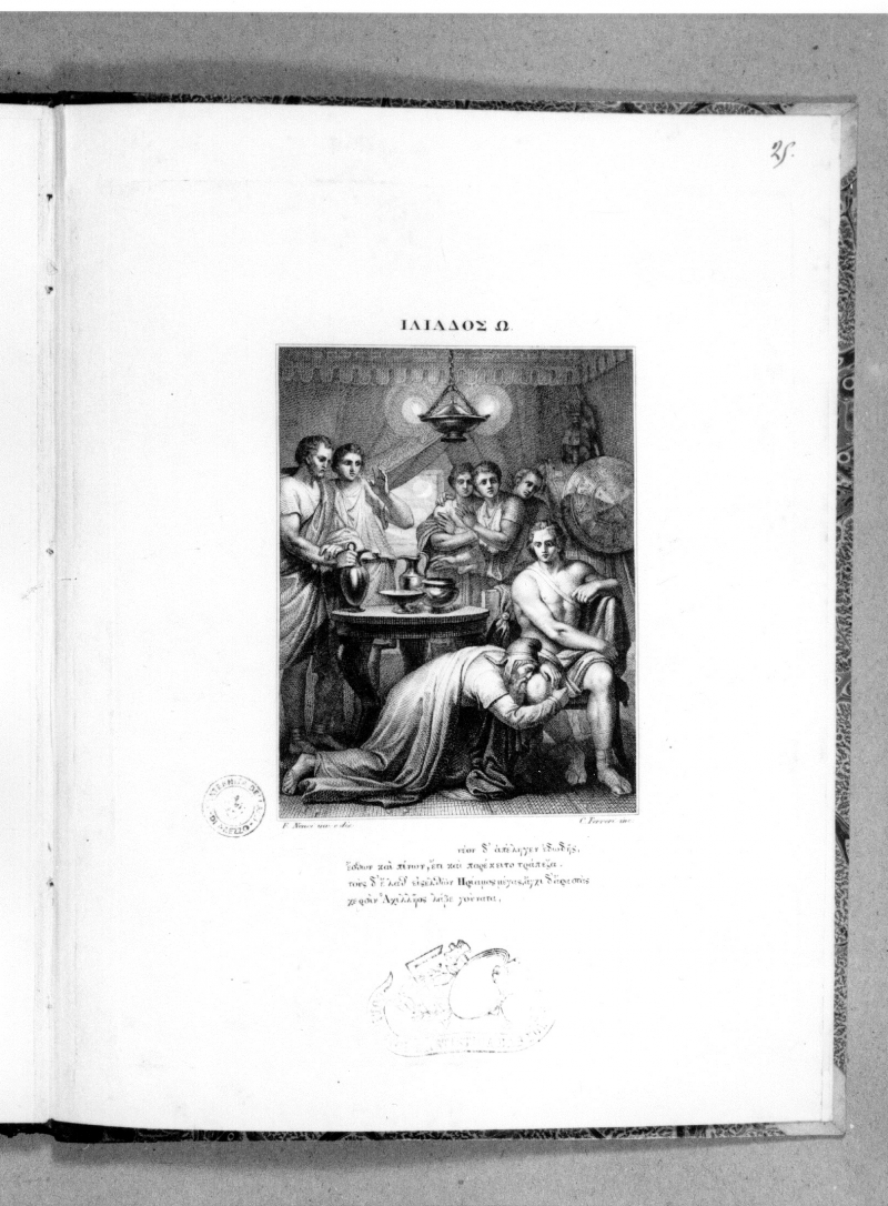 CONTIENE: La raccolta completa (frontespizio + 24 tavole) “Omero Iliade”, Firenze, Tipografia Batelli e figli, 1838, con 25 incisioni a bulino e all’acquaforte (rifilate, Lastra: 265x190) eseguite da G. Scotto (cc. 1, 10-12); M. Zignani (c. 2); A. Viviani (cc. 3, 6-9, 11-12, 16, 23-24); C. Ferreri (Tavv. 4-5, 10, 13-15, 18,19, 25); A. E. Lapi (c. 17) da disegni di F. Nenci.