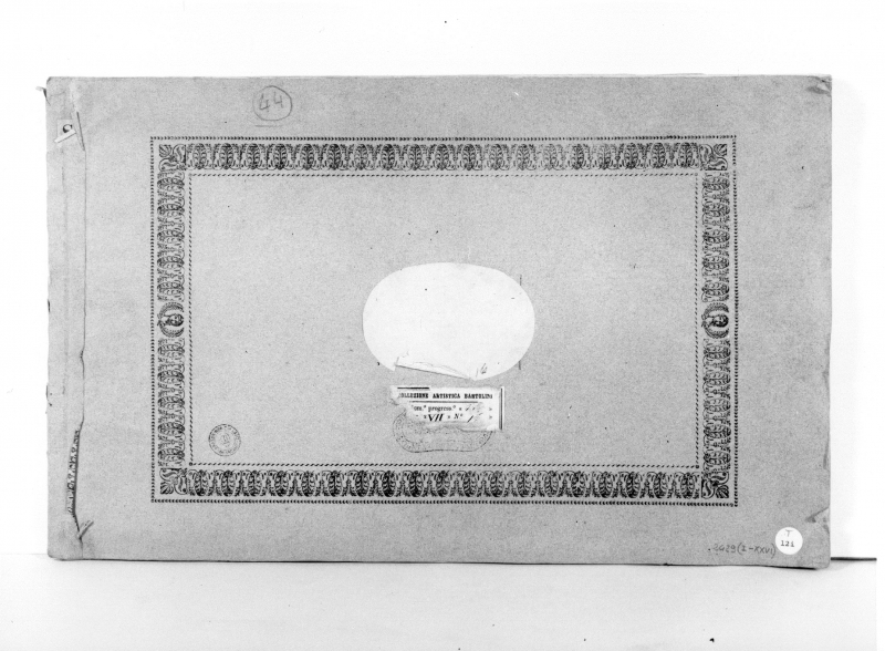 CARTELLINI: nel piatto superiore al centro è stato incollato il cartellino stampato "COLLEZIONE ARTISTICA BARTOLINI/catalogo/Num. progress. […]/[…] VII N. […]. Nel piatto superiore in basso a destra, è stato incollato un cartellino circolare stampato "12i" al di sopra manoscritta a lapis "T".
