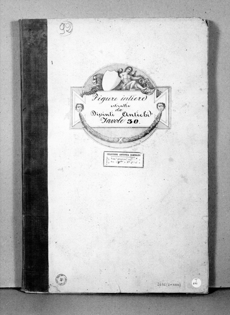 CARTELLINI: Nel piatto superiore al centro è stato incollato il cartellino stampato "COLLEZIONE ARTISTICA BARTOLINI/catalogo/Num. progress. 3[…] sez. […] N. […]”; Nel piatto superiore al centro, è stato incollato un cartellino ovale con decorazioni (protome leonina, volute, scudo) con all'interno manoscritta a penna e inchiostro: “Figure intiere/ estratte/da/Dipinti Antichi/Tavole 30.”; Nel piatto superiore in basso a destra, è stato incollato un cartellino circolare stampato "49i" al di sopra manoscritta a lapis "T”.