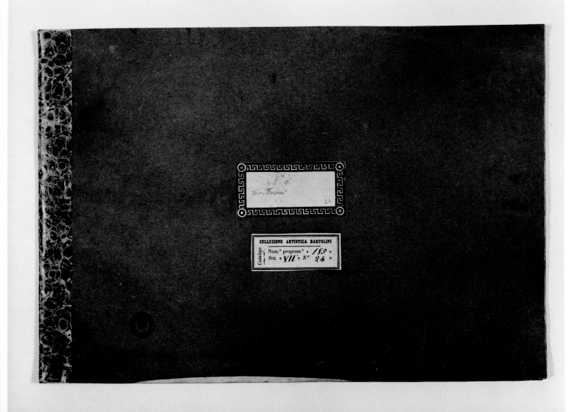 CARTELLINI: Nel piatto superiore al centro è stato incollato il cartellino stampato "COLLEZIONE ARTISTICA BARTOLINI/catalogo/Num. Progress. 185/Sez. VII N.24 "; Nel piatto superiore al centro, è stato incollato un cartellino profilato da una cornice con greca blu stampata, all’interno manoscritta a lapis “N° 6/Contorni/24”.