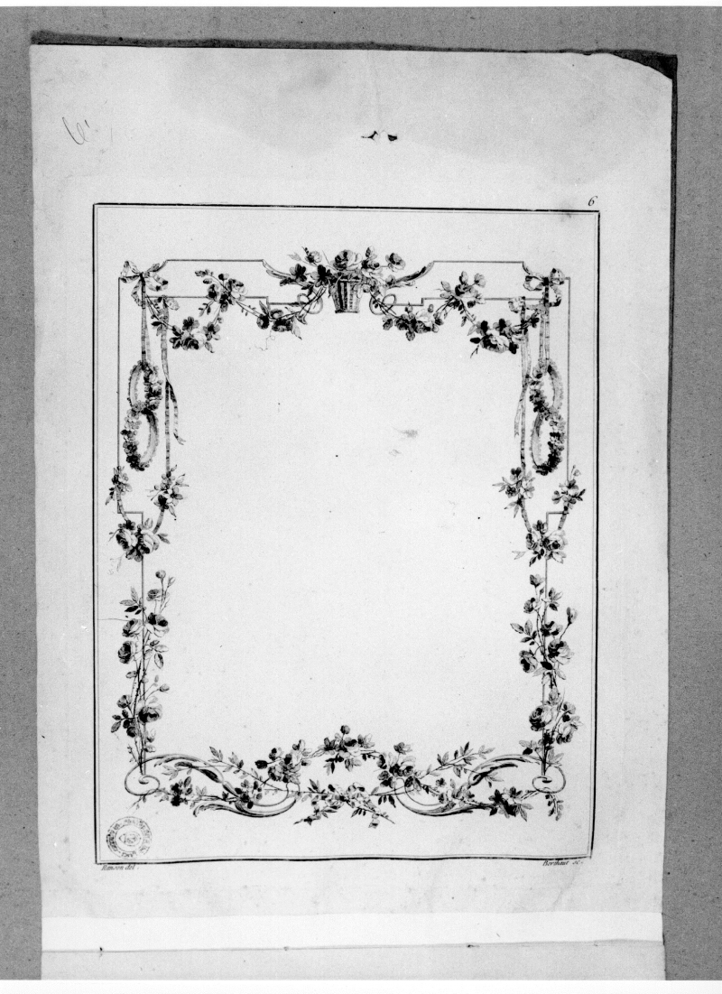 Raccolta frammentaria di 6 stampe (Lastra: 290x223) incise all’ acquaforte numerate progressivamente nell’inciso in alto a destra (N° 1- 6), che riproducono il diciottesimo repertorio con cartelle ornamentali tratte dall’opera “Oeuvres contenant un recueil de trophées, attributs, cartouches, vases, fleurs, ornements et plusieurs desseins agréables pour broder des fauteuils. Composés et dessinés par Ranson et gravés par Berthaut et Voysard”, Esnauts et Rapilly, Parigi, 1778.