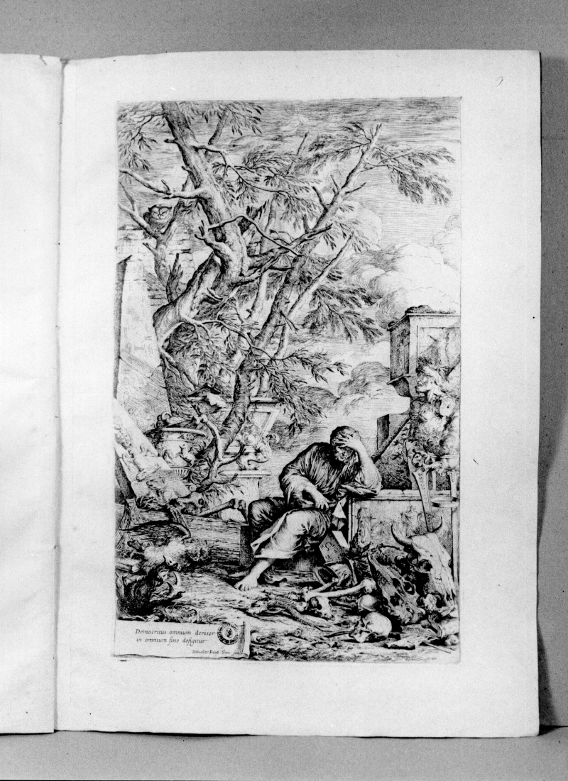 (c. 9): stampa incisa all’acquaforte (Lastra: 457x275), con “Democrito in meditazione” , S. Rosa, 1662.