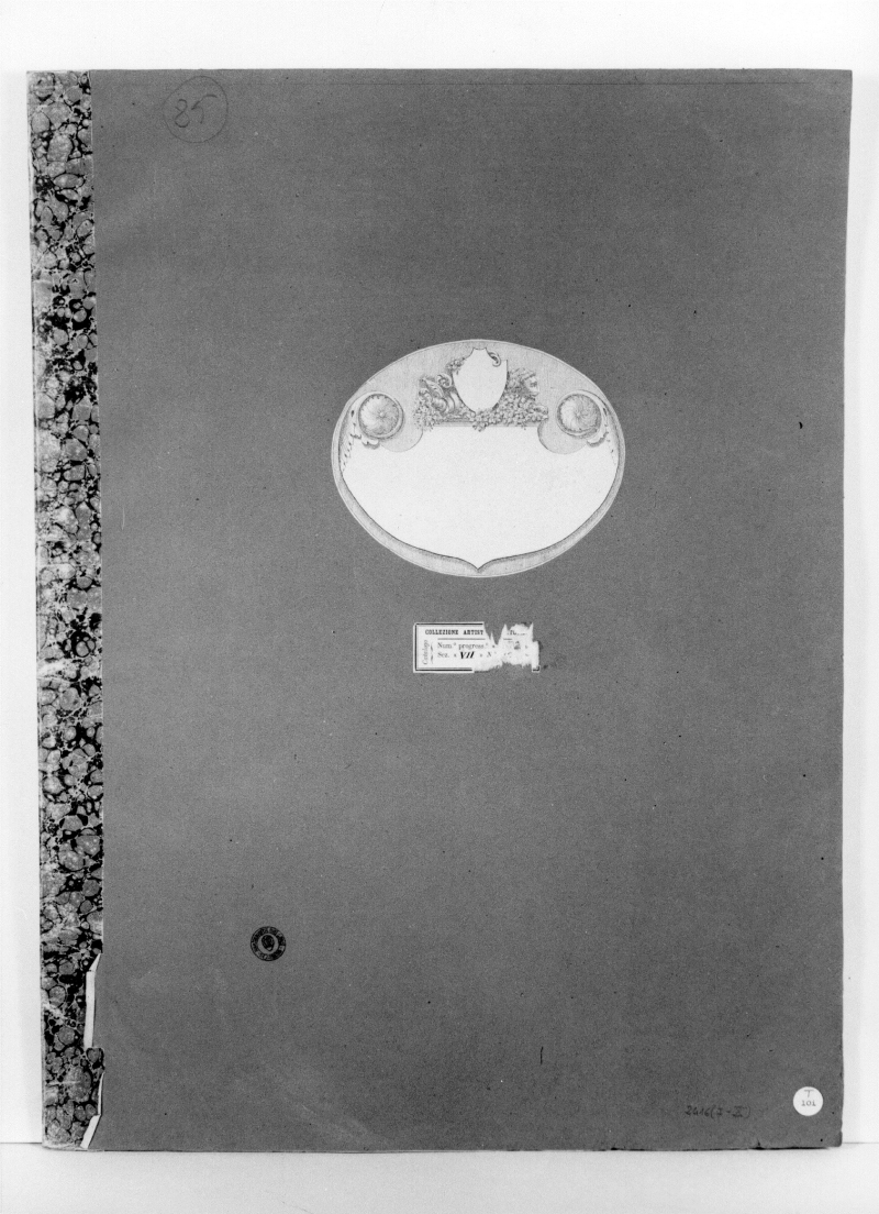 CARTELLINI: Nel piatto superiore al centro è stato incollato il cartellino stampato "COLLEZIONE ARTISTICA BARTOLINI/catalogo/Num. Progress. […]/Sez. VII N.[…] "; Nel piatto superiore al centro, è stato incolato un cartellino vuoto decorato con volute e protome leonina; Nel piatto superiore in basso a destra, è stato incollato un cartellino circolare stampato "10i”, al di sopra la seguente iscrizione, manoscritta a lapis: “T”.