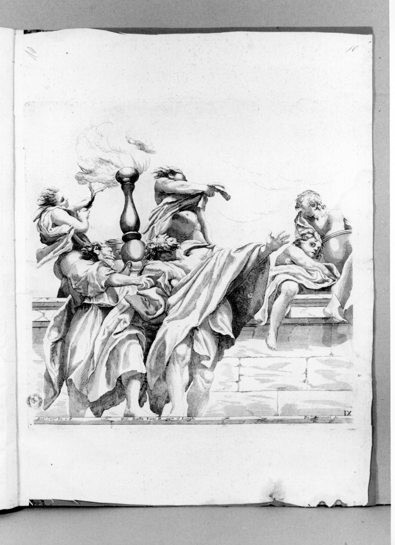 Raccolta frammentaria di 10 stampe incise a bulino tirate direttamente sulla pagina (Lastre: 395x535; 375x370; Foglio: 410x555), appartenenti alla serie di quindici stampe, numerate non progressivamente nell’inciso in basso a destra, rispettivamente: ”I, XV, XIII, XII, XIV, III, X, XI, VIII, IX”; incise da Domenico Bonaveri che nel 1697 dedicava al marchese F. M. Monti Bendini, ricavate da disegni di G. B. Vanni, degli affreschi del Correggio nella cupola del duomo di Parma pubblicati dall'editore Longhi di Bologna nel 1697.