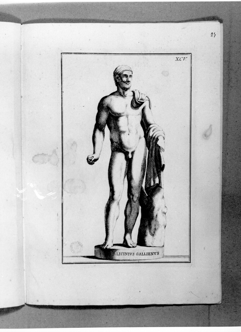 CARTELLINI: Nel piatto superiore, in basso al centro, è stato incollato il cartellino stampato "COLLEZIONE ARTISTICA BARTOLINI/catalogo/Num. progress. 276 sez. VII N. 115”; Nel piatto superiore al centro, è stato incollato un cartellino ovale con decorazioni (protome leonina, volute, scudo) con all'interno manoscritta a lapis: “N. 27 figure/ di scultura antica.”
