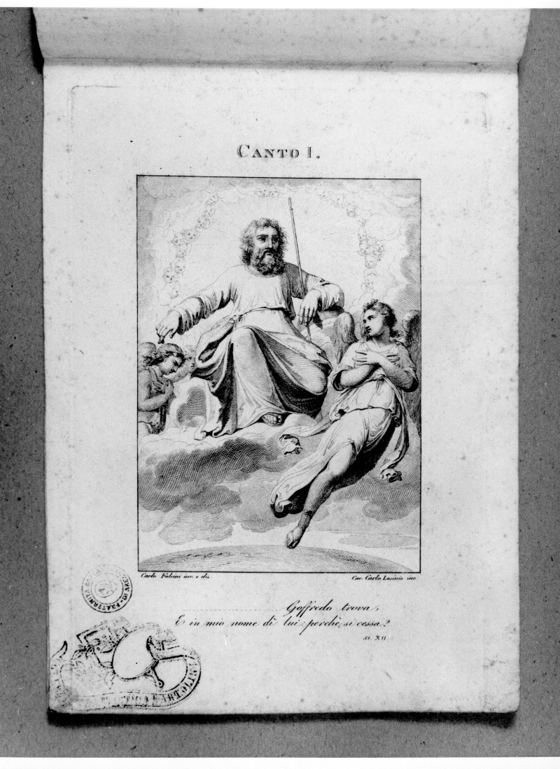 Raccolta frammentaria di 20 stampe all’acquaforte (Lastra:222x150) appartenente alla serie della Gerusalemme Liberata, incise da Carlo Lasinio (cc.1-10), Antonio Verico (cc.11-12; cc. 14-15; cc.17-20) e Marco Zignani (c.13; c.16).