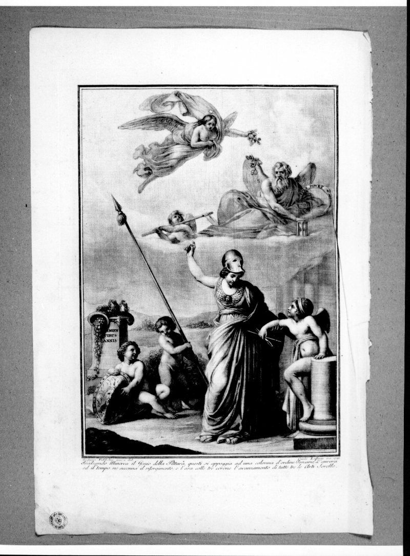 - Iscrizioni: in basso a sinistra:"Giuseppe Fabbrini inv, e del."; in basso a destra:"Carlo Lasinio inc.. 1791."; In basso al centro:"Innalzando Minerva il Genio della Pittura (...) l'avanzamento di tutte e tre le Arti Sorelle"; nel verso in alto a sinistra, manoscritta a matita nera:"7.12.26".
