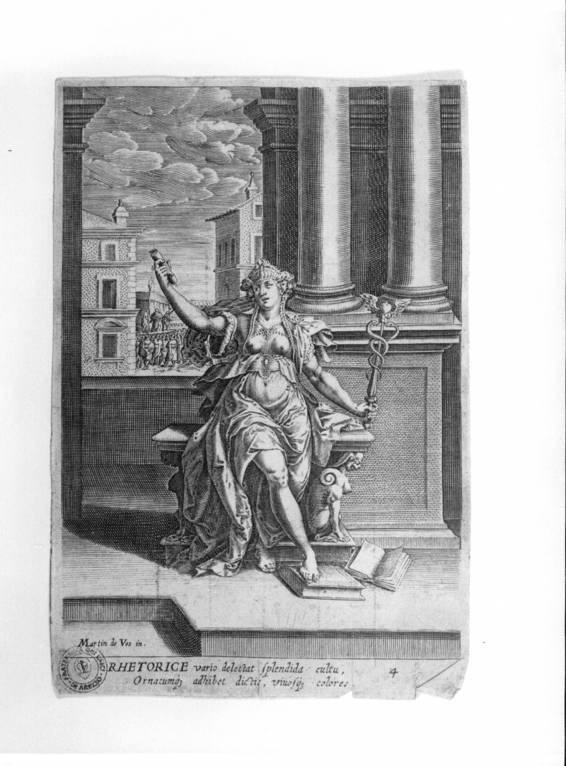 - Iscrizioni: in basso a sinistra:"Martin de Vos in."; in basso al centro:"RHETORICE vario delectat Splendida cultu,/Ornatumq adhibet dictis, viuosq colores"; in basso a detra:" 4"; nel verso, nell' angolo inferiore a destra, manoscritta a matita nera:"123/y 1/c"; nel verso, in alto al centro, manoscritta a penna e inchiostro:"P. F. F.".