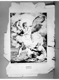 - Iscrizioni: in basso a destra:"Luigi Sabatelli inv. ed inc. Milano"; nel margine inferiore: "Et vidi alium Angelum fortem... et iris in capite ejus... et habebat in manu sua libellum; et posuit pedem suum dexterum super mare, sinistrum super terram... / Levavit manum suam ad coelum, et juravit... quia tempus non erit amplius... Et abii ad Angelum, ut daret mihi librum. Apoc. C. X."; in basso a sinistra, manoscritta a metita nera all'interno di un cerchio:"2"; nel margine sinistro, manoscritta a matita nera:"2".
