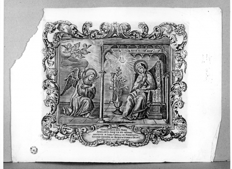 Iscrizioni: Nel margine inferiore, al centro nel cartiglio: "VERA EFFIGIE DIVE MARIE/ ANGELORUM ASSISY EX SUO ORIGINALI/EXISTENTE IN SACRA CAPELLA DE PORZIUNCULA/EIUSDEM DEVOTIS, AC BENEFACTORIBUS DICATA/Quam P. Guardianus anno 1767. instauravit"; Nel verso del foglio, nel margine laterale sinistro, manoscritta con inchiostro: "Per/il signor/ [...] maetaro/[...] nipeto/Roma".