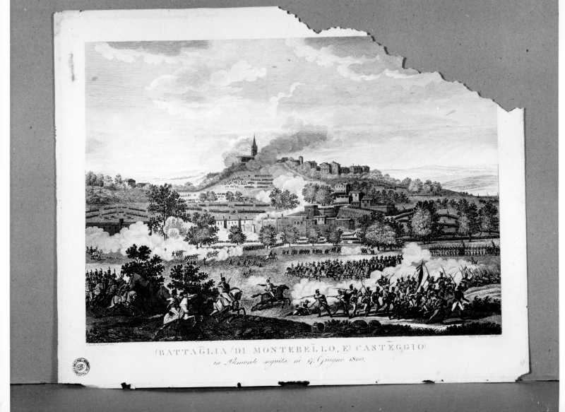 - Iscrizioni: in basso a sinistra:"Carlo Vernet dis."; in basso a destra:"Ant: Verico incise"; in basso al centro:"BATTAGLIA DI MONTEBELLO, E CASTEGGIO/in Piemonte seguita nè 9. Giugno 1800.".