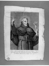 - Iscrizioni: in basso a sinistra:"Gius: Pera dis:"; in basso a destra: "G. B. Cecchi inc:"; in basso al centro: "BEATO LEONARD DA PORTO MAURIZIO/Miss:o Apo:o del Ritiro del Monte di Firenze. Morto in Roma/ in S. Bonaventura li 26 obre 1751 in età di anni 76, e beatificato/nella Basilica vaticana il di 19 Giugno 1796."; nel verso, in basso a destra, manoscritta a matita nera:"31/y 1/c".