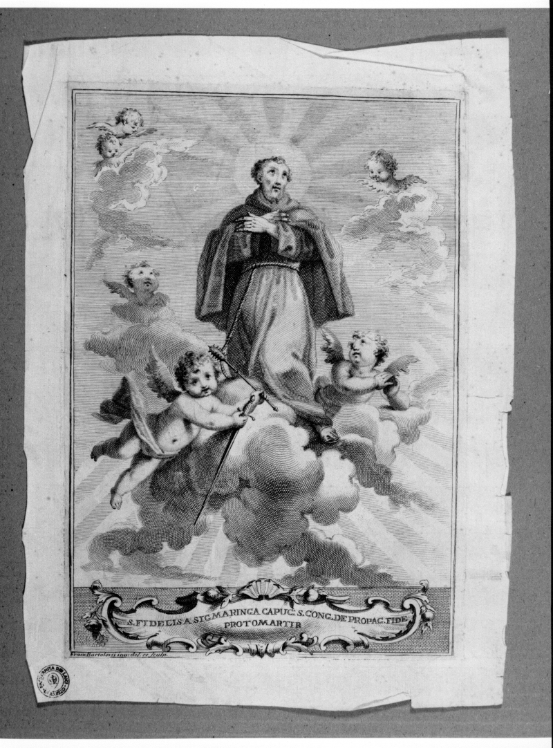 - Iscrizioni: in basso al centro, all'interno di un cartiglio: "S. FIDELIS A SIGMARINGA CAP: S. CONG. DE PROPAG. FIDE/PROTOMARTR";in basso a sinistra:"Franc Bartolozzi inv: del: et Sculp."; nel verso, in basso a destra, manoscritta a matita nera:"17/y 1/c".