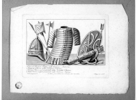 - Iscrizioni: in basso a sinistra "L. Roccheggiani dis."; in basso al centro:"In Roma presso A. Franzetti nel Corso alle convertite."; in basso a destra:"P. Ruga inc. 1806"; nel margine inferiore a sinistra:"1. Elmo ed Insegna Partica nella Colonna Antonina./2. Corazza Dacica nella Colonna Traiana./3. Turcasso Dacico nel piedistallo alla Colonna Traiana./4. Scudo Dacico scolpito parimenti nella colonna Traiana.".