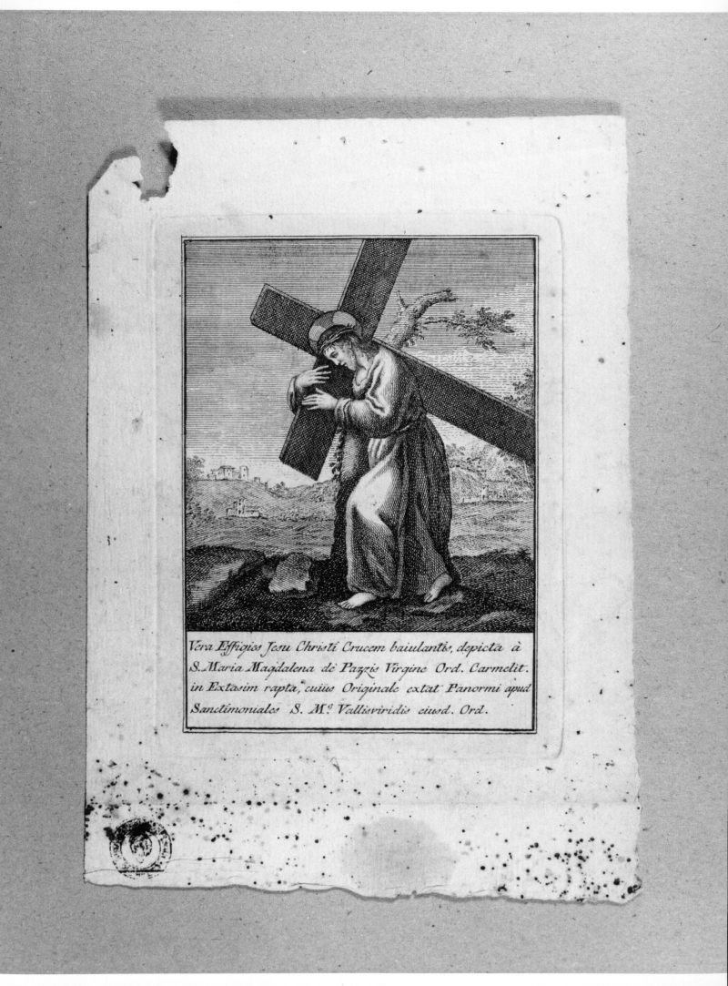 - Iscrizioni: in basso al centro, all'interno della figurazione:"Vera Effigies Gesù Christi Crucem Baiulantis, depicta a/S. Maria Magdalena de Pazzis Virgine Ord. Carmelit./In Ecstasim rapta, cuius Originale extat Panormi apud/Sanctimoniales S. MG. Vallisviridis eiusd. Ord.".