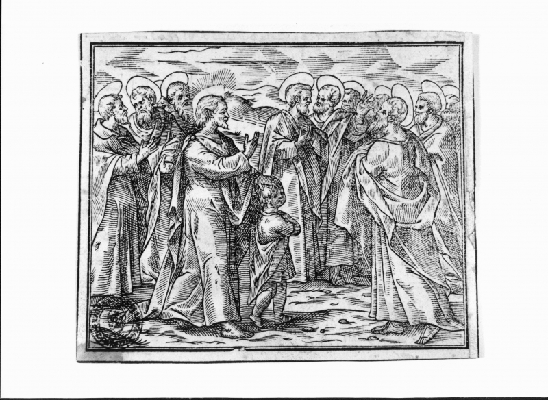 Cristo che predica alle genti con mano sopra la testa di un fanciullo.