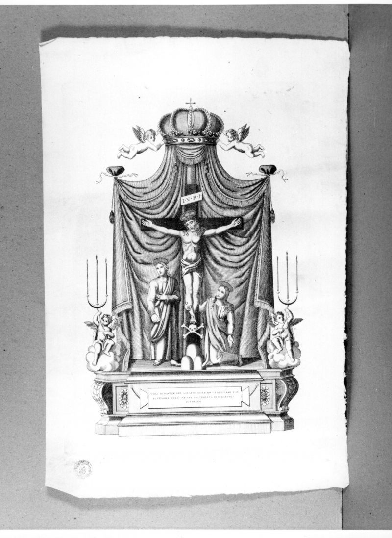 Iscrizioni: In basso al centro, nel cartiglio: "VERA IMMAGINE DEL MIRACOLOSISSIMO CROCEFISSO CHE/SI VENERA NELL'INSIGNE COLLEGIATA DII S. MARTINO/DI FOIANO"; nel margine inferiore, al centro :"Brogiotti inc. Siena".