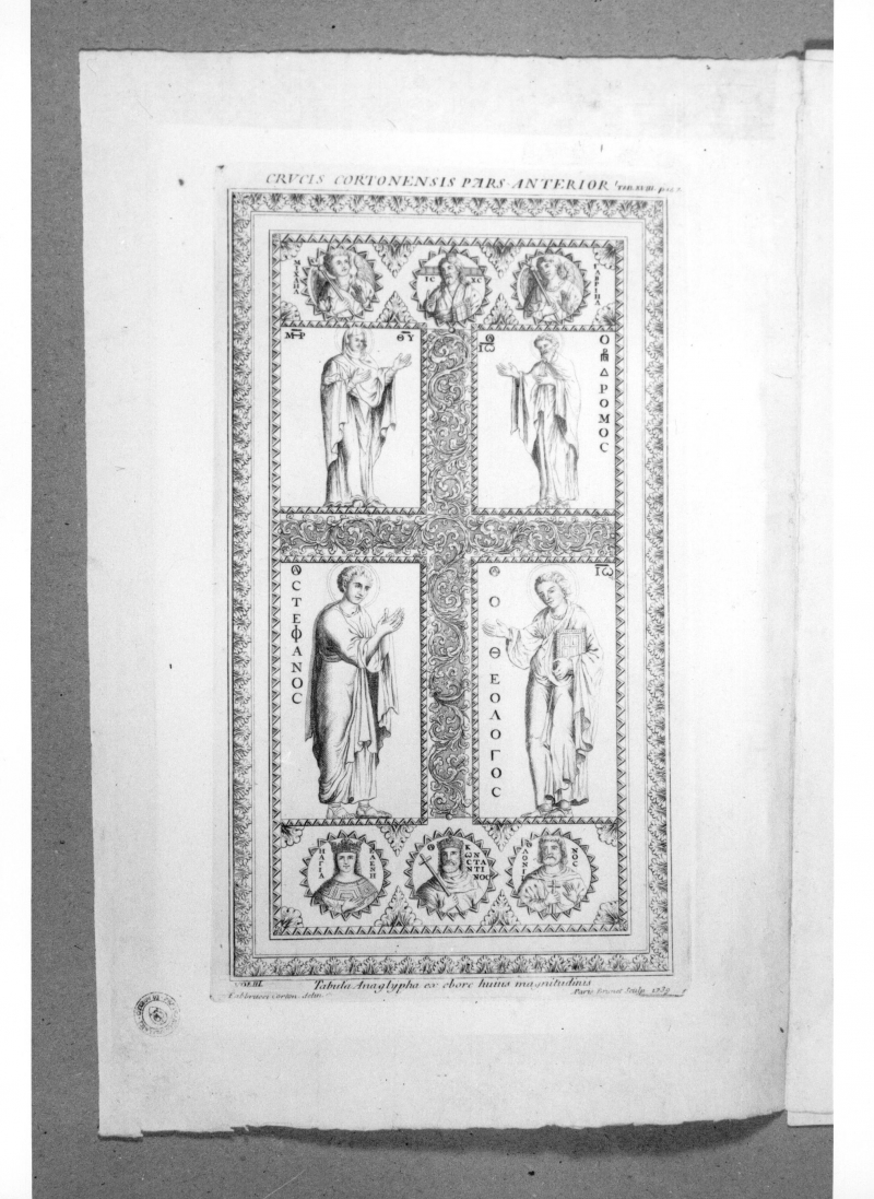 Iscrizioni: in basso a sinistra: " VOL. III/Fabbrucci Corton. del."; in basso a destra: "Paris Brunet Sculp. 1739"; nel margine superiore: "CRUCIS CORTONENSIS PARS ANTERIOR TAB. XVIII. p. 137"; nel margine inferiore: Tabula Anaglypha ex ebore huius magnitudinis