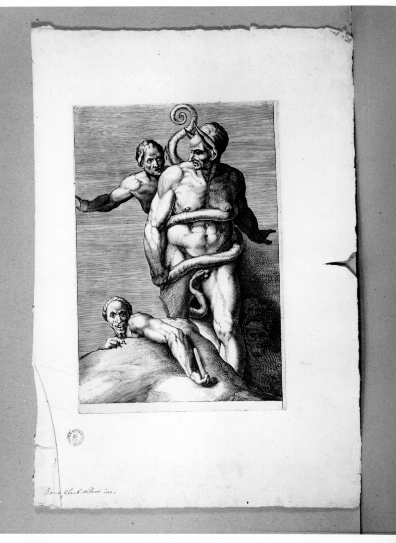 - Cinque uomini, di cui uno in primo piano con orecchie d'asino e avvolto da un serpente che gli morde il fallo, dal Giudizio di Michelangelo.