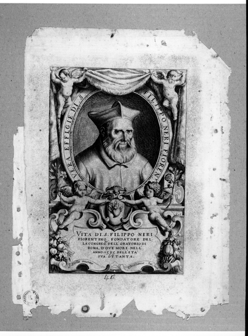 - Iscrizioni: all'interno della figurazione, nel giro del medaglione:" VERA EFFIFGIE DI. S. FILIPPO NERI FIOREN."; in basso, al centro, all'interno di un cartiglio:"VITA DI.S. FILIPPO NERI/FIORENTINO. FONDATORE DEL/LA CONGREG.ne DELL' ORATIORIO DI/ ROMA, DOVE MORI NELL’/ ANNO. 1595. NELL’ETA'/ SVA OTTANTA./ J. Stella inventor - Christianus Sas Sculp"; in basso al centro, manoscritta a penna e inchiostro:"42"; nel verso, in basso a destra, manoscritta a matita nera:"21/y 1/c".