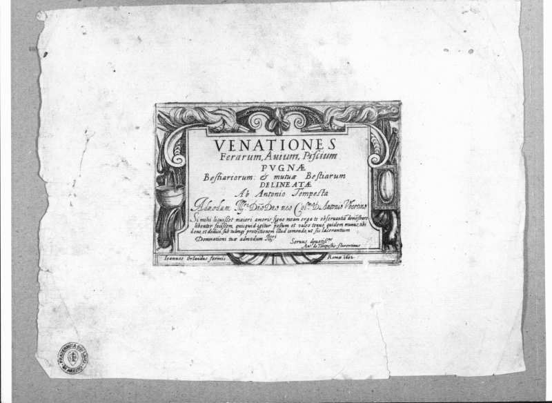 - Iscrizioni: in basso a sinistra: " Ioannes Orlandus formis";/."; in basso a destra:"Seruus devotiss.us/Ant. de in basso a destra:"Roma 1602" ; al centro: "Ferarum, Auium, Piscium/PVGNAE/Bestiariorum: e mutuae Bestiariorum/DELINEATAE/Ab Antonio Tempesta/Adnodum (...)/Dominationi tuae admodum Illri"; nel verso, in basso a destra, manoscritta a matita nera: "118/y 1/c".