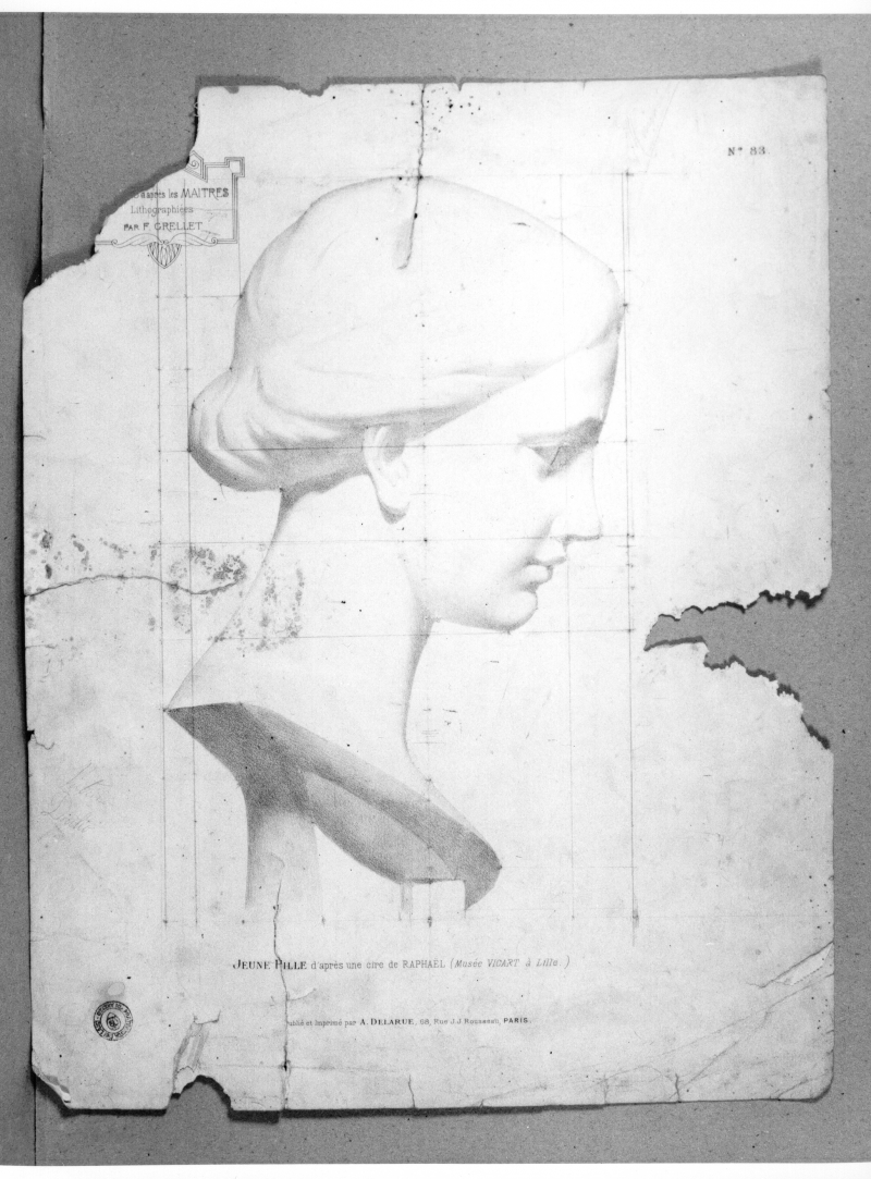 - Iscrizioni: In basso al centro: " JEUNE FILLE d'après une cire de RAPHAEL (Musée VICART à Lille.)"; nel margine inferiore, al centro: " Pubblié et Imprimé par A. DELARUE, 68, Rue, J.J. Rousseau, PARIS"; all'interno di un cartiglio, in alto a sinistra:"ETVDES d'après les MAITRES/ Lithographiées/PAR F. GRELLET."; in alto a destra:"N° 83"; nel margine laterale, a sinistra, manoscritta a matita nera:"Pubini/Duilio"; in alto al centro, manoscritta a matita nera:"Maniseni".