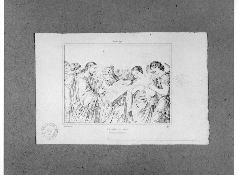 - Iscrizioni: in basso a sinistra:"A. Varotari P."; in basso a destra:"298."; in basso al centro:"LA FEMME ADULTERE/LA DONNA ADULTERA"; all'interno della figurazione, in basso a destra:"AR"; all'interno della figurazione, in alto a destra:"ALEXANDRI/VAROTARII PATAVINI/OPUS."; in alto al centro:"Tavola 3gg.".