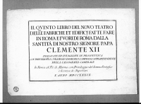 - Iscrizioni:al centro:"IL QVINTO LIBRO DEL NOVO TEATRO/DELLE FABBRICHE ET EDIFICJ FATTE DARE/ IN ROMA E FVORI ROMA DALLA/SANTITA' DI NOSTRO SIGNORE PAPA/CLEMENTE XII/ DISEGNATE ED INTAGLIATE IN PROSPETTIVA/CON DIREZZIONE E CVRA DI GIO. DOMENICO CAMPIGLIA SOPRAINTENDENTE/DELLA CALCOGRAFI CAMERALE/In Roma al Piè di Marmo con Privileggio del Sommo Pontefice/e licenzia de Superiori/L'ANNO MDCCXXXIX;in basso a destra:"1".