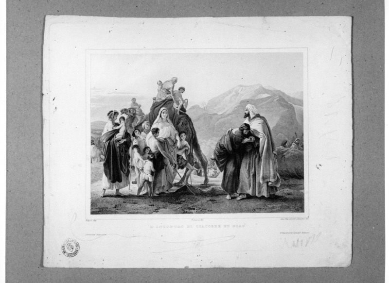 Iscrizioni: nel margine inferiore a sinistra: "Cornienti impresse"; nel margine inferiore al centro:"L'INCONTRO DI GIACOBBE ED ESAU'"; nel margine inferiore a destra:"P. Ripamonti Carpano Editore."; basso a sinistra:"Hayez dip."; in basso al centro: "Verazzi dis."; in basso a destra:"Gius. Ripamonti Carpano inc.".