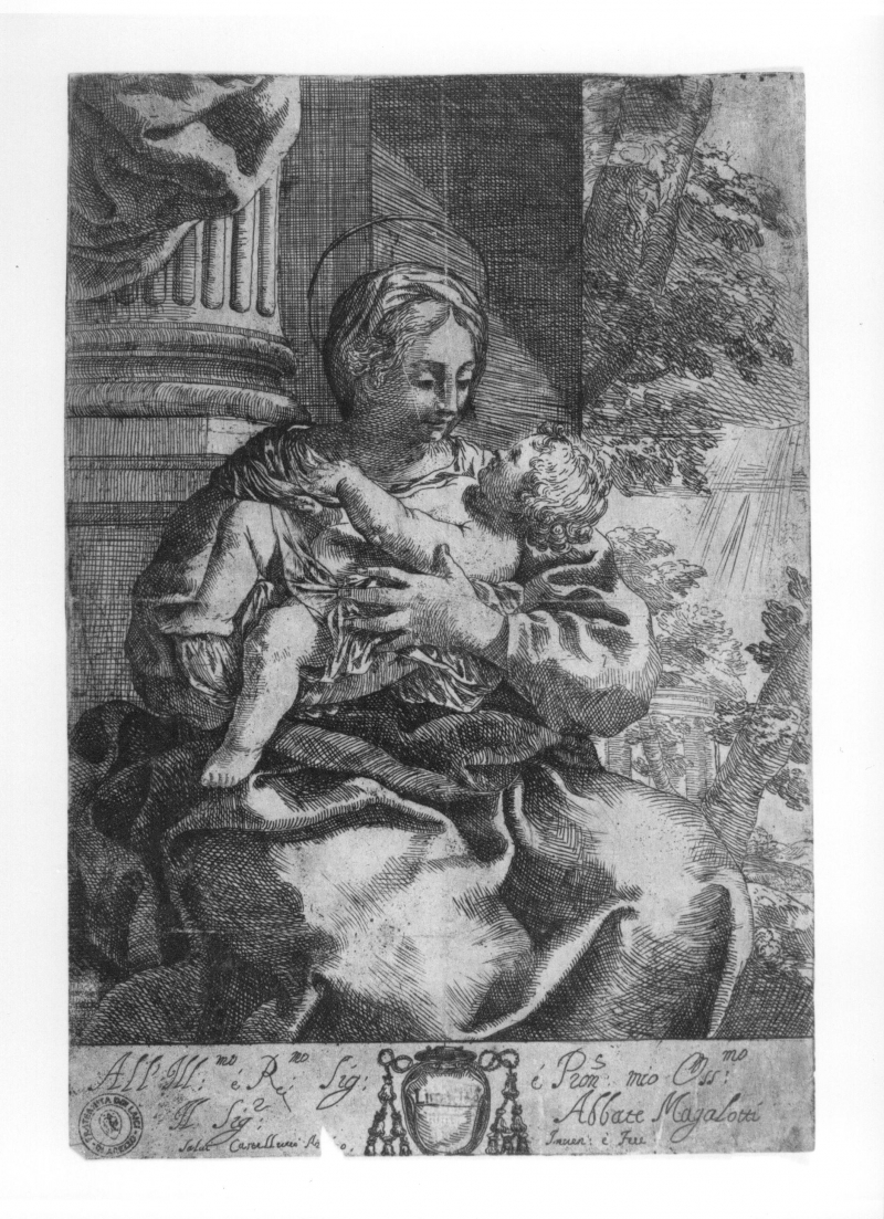 - Iscrizioni: recto:in basso al centro:All'Ill.mo e R.mo Sig. è Pros: mio Oss. mo/Ill Sig: Abbate Magalotti/ Salvi Castellucci [...] Inven: e Fece." Verso: in basso a destra, manoscritta a matita nera:"74/1/Y/1/C".