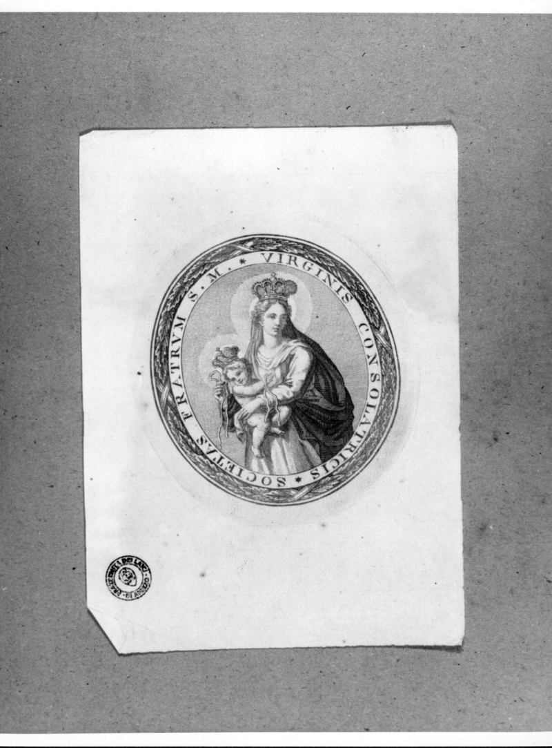 - Iscrizioni: all'interno della figurazione, nel giro del medaglione."SOCIETAS FRATRVM S. M. VIRGINIS CONSOLATRICIS".