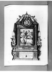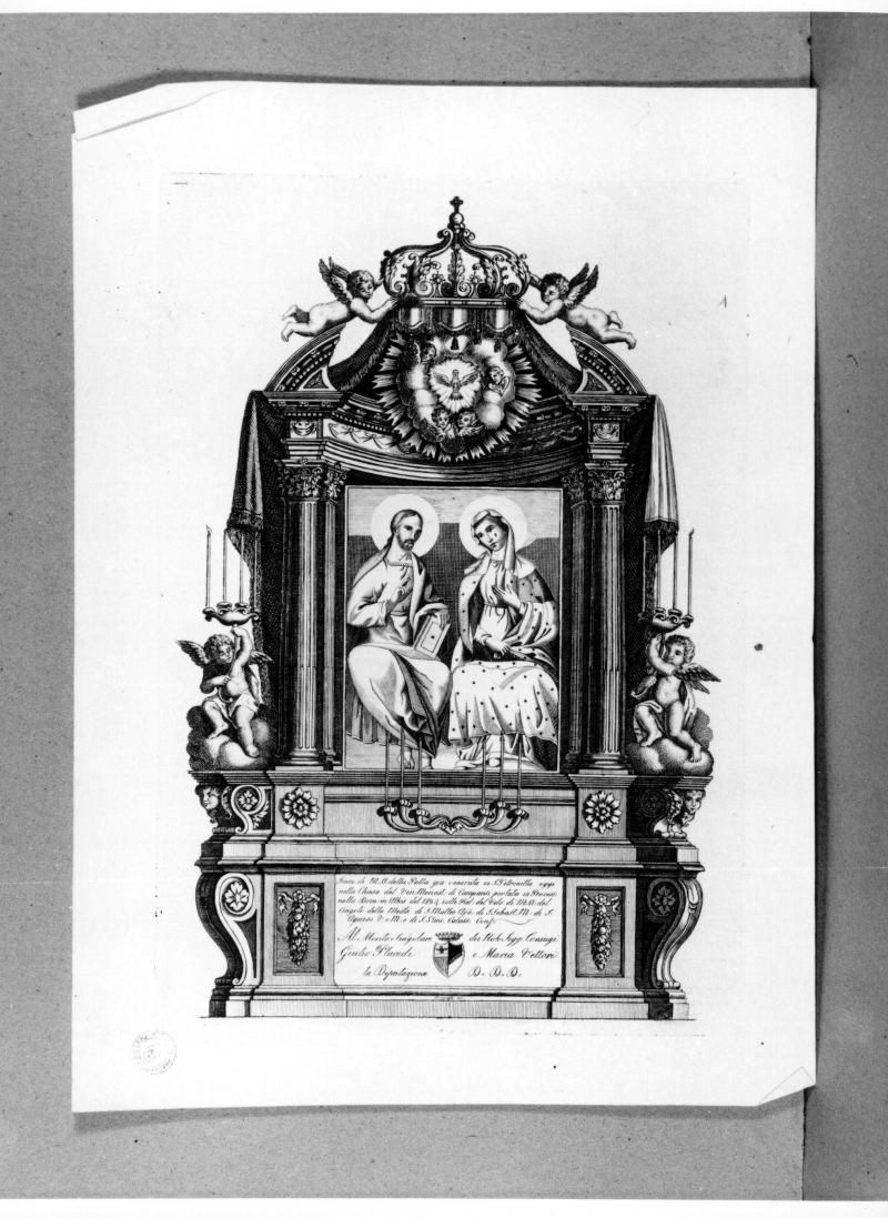 Iscrizioni: In basso:" Imm. di M. SS: della Palla già venerata in S. Petronilla oggi/nella Chiesa del Ven: Monast: di Campansi portata in Process:/nella Dom: in Albis del 1824 colle Rel: del Velo di Miss: del/Cingolo della Meda di S. Matteo Apo: di San Sebast: M: di S./Agnese V: e M: e di S: Gius: Calass: Conf. /Al Merito Singolare dei Nob: Sigg: Coniugi/Giulio Placidi e Maria Vettori/la Depatazione D. D. D.".