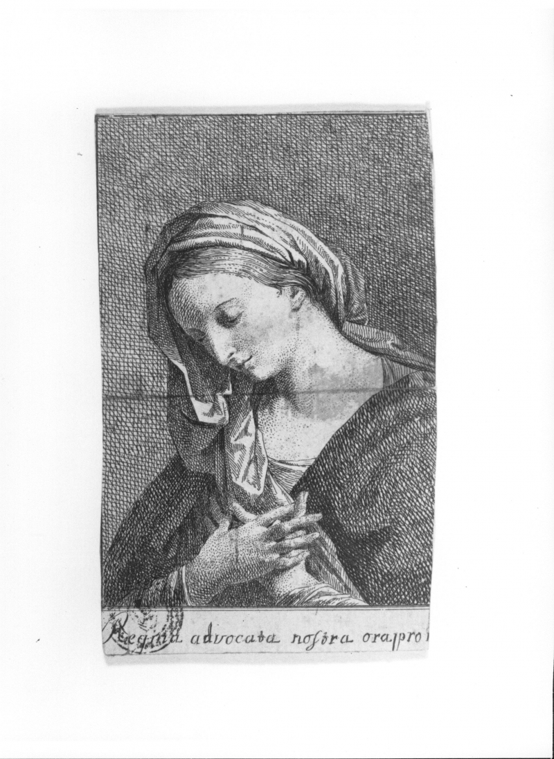 - Iscrizioni: in basso al centro:"Regina advocata nostra orapro[...]"; nel verso, in basso a destra,manoscritta a matita nera:"115/y 1/c".