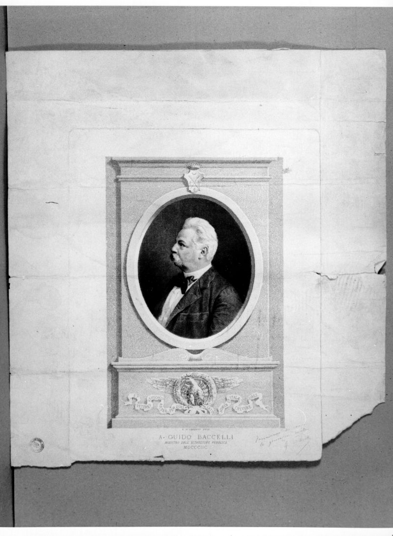 Iscrizioni: In basso, nel cartiglio:"ET DETERES REVOCAVIT ARTES - PER QUAS LATINUM NOMEN ET ITALAE- CREVERE VIRES...". Nel margine inferiore al centro:" T.DI LORENZO FECE/ A GUIDO BACCELLI/ MINISTRO DELL'ISTUZIONE PUBBLICA/ MDCCCIIC". Nel margine, in corrispondenza dell''angolo a destra: "Innamoriamo dei campi/ le generazioni novelle/ G. Baccelli".