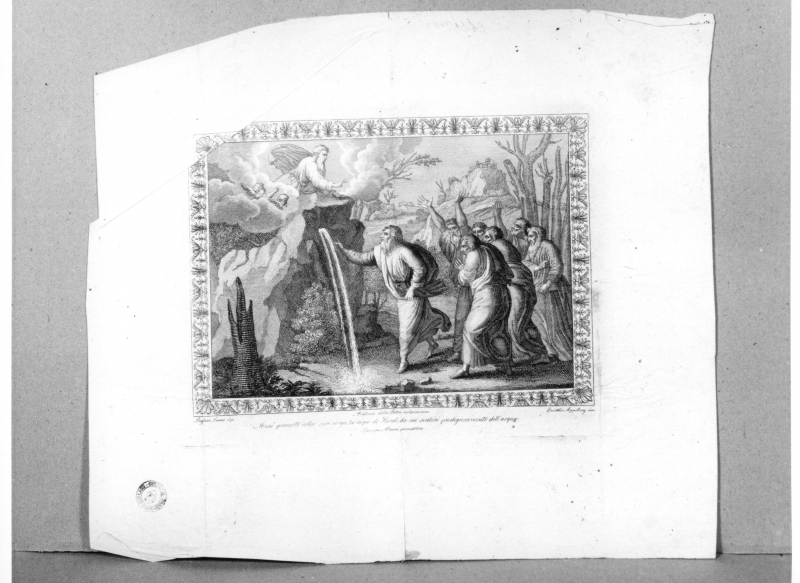 Iscrizioni: nel margine inferiore, al centro: "Mosè percuote colla sua verga la rupe di Horeb, da cui scaturì prodigiosamente dell'acqua./Giuseppe Manni Provveditore"; in basso a sinistra:"Raffaele Sanzio dip."; in basso a destra: "Quintilio Appollony inc."; nel verso, in alto, manoscritta ad inchiostro: "anno 1838".