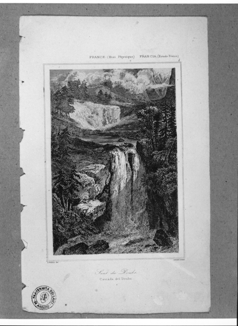 - Iscrizioni: in basso a L. Thienon"; in basso a destra: "Lemaitre direxit"; in basso al centro:"Sant du Doubs/Cascada del Doubs."; in alto a destra:"FRANCE. (etat Physique) FRANCIA. (Estado Fésico)"; nel verso, in basso a destra,manoscritta a matita nera:"113/y 1/c".