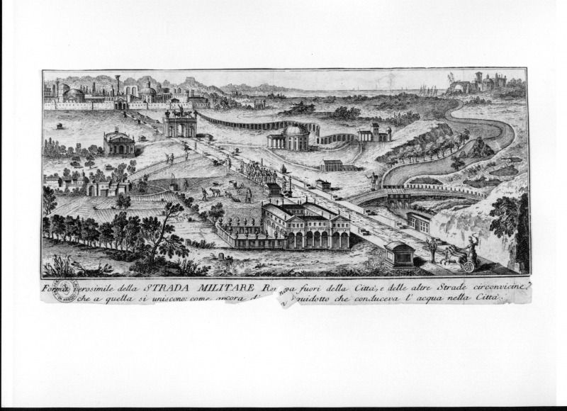 - Iscrizioni: recto:in basso al centro:"Forma verosimile della STRADA MILITARE Romana fuori della Città, e delle altre Strade circonvicine/ che a quella si uniscono; come ancora di un Acquidotto che conduceva l'acqua nella Città:" Verso: in basso a destra, manoscritta a matita nera:"80/1/Y/1/C".