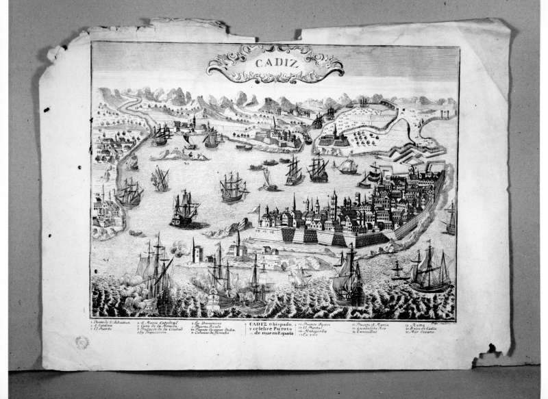 - Iscrizioni: in basso a destra:"Fran.o Ambrosi Inc."; in basso al centro:"CADIZ Obispado,/y celebre Puerto/de maren Espana"; in alto al centro:"CADIZ".