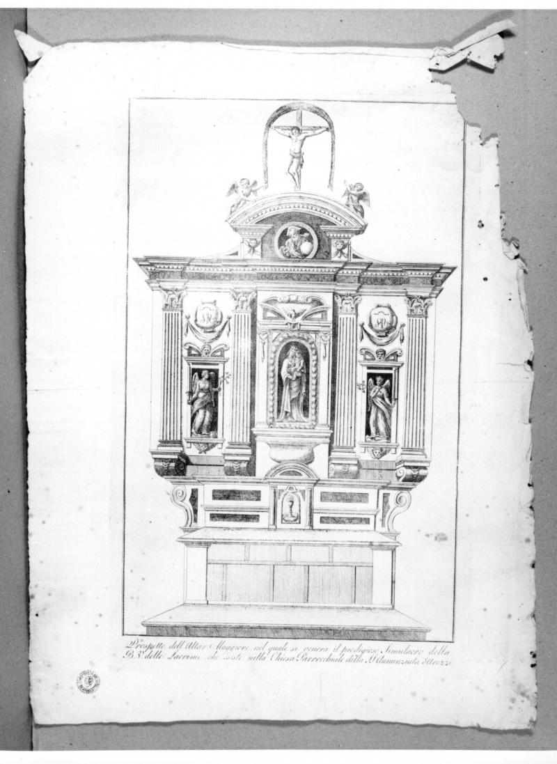 - Iscrizioni: in basso a sinistra:"F. Nenci dip."; in basso a destra:"Gaet. Giarrè inc:"; in basso al centro:"Prospetto dell'Altar Maggiore, nel quale si venera il prodigiosoSimulacro della/B. V. delle Lacrime che esiste nella Chiesa Parrocchiale della SS. Annunziata d'Arezzo.".