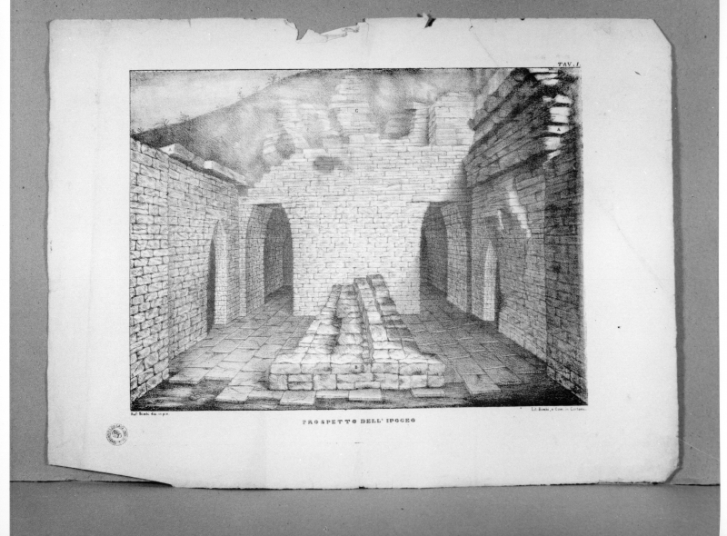 La litografia è la tav. I della pubblicazione a stampa: "Tavole dimostrative l'ipogeo di Camuscia /. dichiarato da Melchiorre Missirini", Lit. Bimbi, Cortona, 1843, composta da 7 tavole illustrate. Nella collezione si conserva un esemplare completo della suddetta pubblicazione (vedi rif. orizzontale).