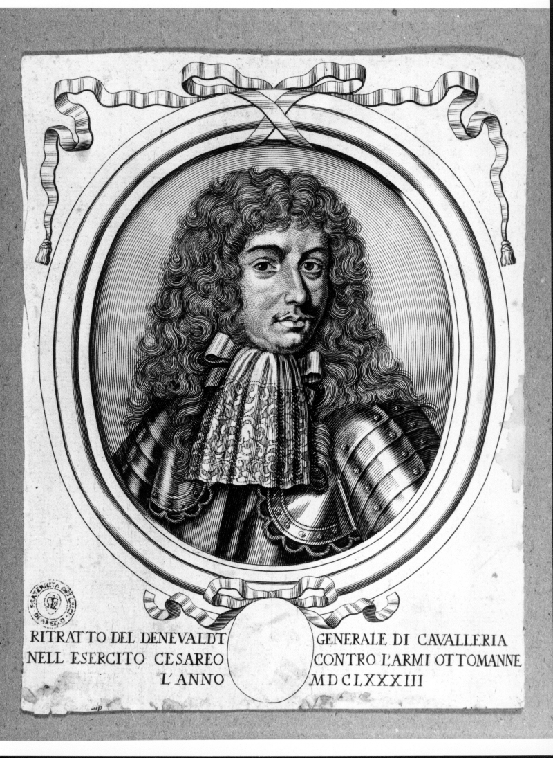 - Iscrizioni: in basso al centro:"RITRATTO DEL DENEVALDT GENERALE DI CAVALLERIA/ NELL ESERCITO CESAREO CONTRO L'ARMI OTTOMANE/L'ANNO MDCLXXXIII".