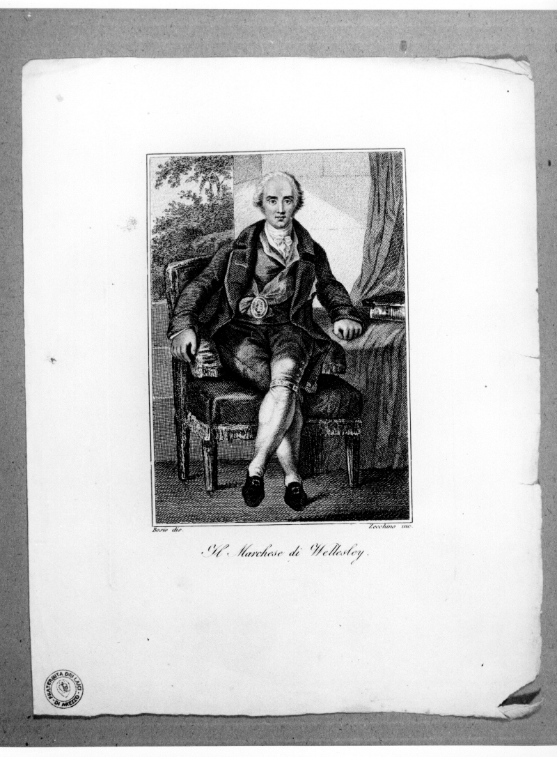 - Iscrizioni: in basso al centro:" Il Marchese di Wellesley .";in basso a destra:" Zecchino inc."; in basso a sinistra:"Bosio dis.". Stampa tratta da:"Serie di vite e ritratti de' famosi personaggi degli ultimi tempi. Opera dedicata a Sua Eccellenza il Signor conte Enrico di Bellegarde".