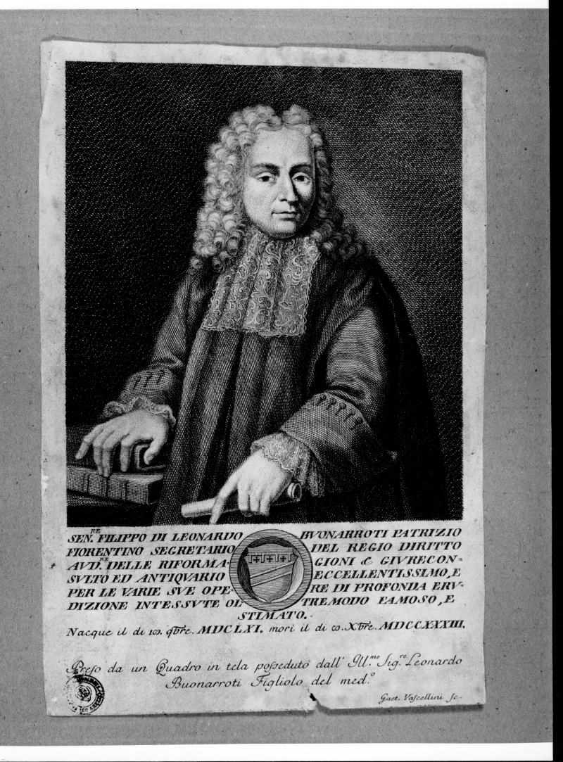 Iscrizioni: in basso a destra:"Gaet. Vascellini Sc."; in basso al centro:"SEN.RE FILIPPO DI LEONARDO BVONARROTI (...) / Preso da un Quadro in Tela posseduto dall' Ill.mo Sig.re Leonardo Buonarroti Figliolo del med.o".
